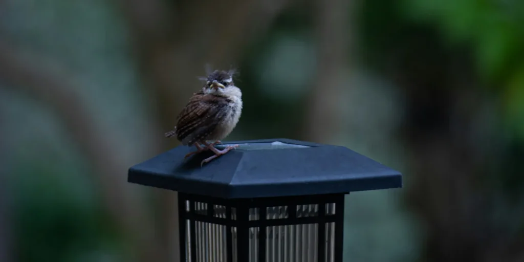 A fledgling is a bird that has left the nest intentionally. It’s covered in real feathers — it might look a little scraggly with a stubby tail and some fluffy patches still showing, but it’s feathered. It can hop. It can grip a branch with its feet. It probably looks at you with bright, alert eyes. It might even try to hop away from you.